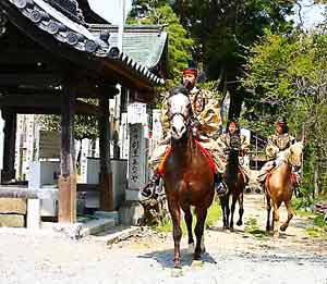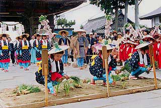 | ――今年こそは。 訪れたのは翌年の春、4月3日の昼下がりだった。 幼児たちの可愛いい歓声が溢れる御田植祭の日で、笛や太鼓のお囃子につれて古式豊かにお田植えの真似事をするのだという。 ところが4月3日は、まだ稲の籾まきもしていない。だから苗の代わりに、よく似た福ダマ(ジャノヒゲ)を使って田植えのマネゴトをしていた。 裾まで届く真赤な羽織を着て、カサボコを被った園児たちは、まるでお稚児さんのようだった。カサボコというのは、大きな傘の上に鉾や薙刀、造花を取り付けたもので、このお田植祭に早乙女となって出演する園児たちのカサボコには、花飾りが取り付けられていた。 ――山の神が、花に乗って田に降りる。 そんな信仰のありようを巧く表現したのだろう、播磨の実りの風土を偲ばせるには十分な仕掛けだった。 広峯神社は京ではなく、古代から栄えた肥沃な播磨平野に存在してこそ、その価値がある。 クヌギやナラが茂る雑木林。点在する谷や沢。四季折々に変化する広嶺山の表情…。 そんな自然の息吹には目を見張るものがあるのだが、4月3日に田植した仮田にはたちまちのうちに稲が稔り、そして4月18日には、収穫を終えた穂揃え式が行われるという。 この式には、走馬式という珍しい馬駆け神事があると聞いていたので、ふたたび出かけてみることにした。 お田植祭にはチラホラ咲きだった境内の桜も、この頃になると、あるかなしかの微風に誘われて散り急いでいた。 拝殿横には、各地から寄進された稲穂がずっしりと大きな束で、ワセ、ナカテ、オクテとそれぞれ奉献され、神職が3本のクジを引いて占うのだという。 続く走馬式では、駒つなぎ場から3頭の馬が引き出され、王朝時代の武官の装束を身に着けた若者が神殿前を駆け抜けた。 ――今となってはこの走馬式こそが、関東御家人だった広峯の祖先を忍ぶ、唯一のものになってしまいました。 神職は、囁きながら話してくれた。 |
