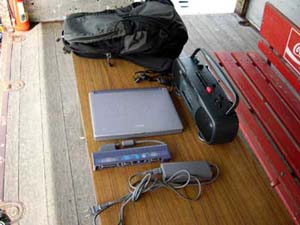 ■ バッグの中身バッグの中にはノートPCと、その電源、ゴールライン横に置いておくラジカセが入ってます。 |
