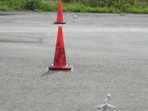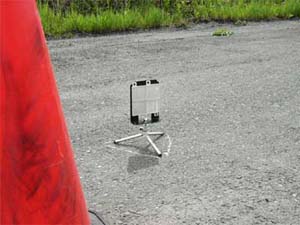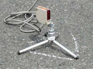 ■ スタートライン設置状態です。センサー、反射板ともにデジカメ用の小さな三脚を使用しています。ケーズデンキで1980円でした、安売りの3脚が買えてしまう値段ですが、たたんだ時のコンパクトさが気に入ってコレにしました。風の影響を避ける為にギリギリまで足を広げて低く設置しています。 |