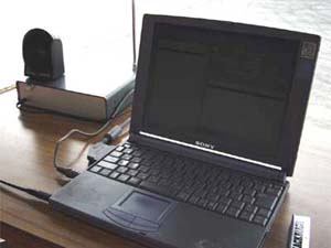 ■ PC設置状態計測中です。左側の箱がFMトランスミッターで、中にはTelstar TR-10RDXや、外部スピーカー用のアンプなどが内蔵されています。 |