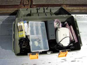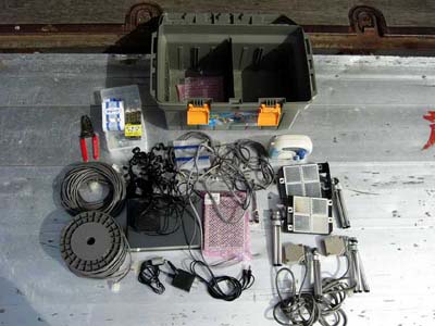 ■ 工具箱の中身工具箱の中にはセンサーをつなぐケーブル、スイッチング電源、FMトランスミッタ、スタート、ゴール用の2組のセンサー、雨の日の為に防水型のお風呂ラジオなどが入ってます。 |