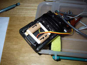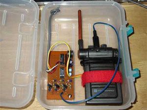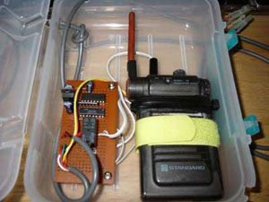左側にあるのが制御基板、右側がSTANDARDの特定省電力トランシーバー HX-610 です。HX-610の場合は2.5mmのモノラルミニプラグの端子間を導通する事で送信をONに出来ました。トランシーバーのスケルチはOFFにしておくのがミソです。ケースは100円ショップで買って来たもの。加工も楽だし電波もさえぎらないので丁度良い。 回路内の3端子レギュレーターからの5Vをトランシーバーにも供給しています。これでトランシーバーの電池も気にしなくて済みますね。