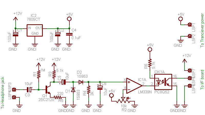 ヘッドフォンジャックからの信号を電圧に変換し、半固定抵抗に設定された電圧とコンパレーターで比較しています。コンパレーターの反転入力の電圧より非反転入力の電圧が低くなるとコンパレータ出力はLowになり、それによってフォトカプラ内のLEDに電流が流れます。フォトカプラ内LEDが光る事で出力トランジスターがONになりプリンターI/Fへ信号が伝えられます。