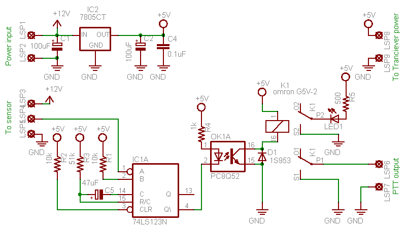 回路図です。バイク用の12Vバッテリーを電源として使用。光電センサーからの信号をトリガにして74LS123で作られたワンショットパルス分(約0.8sec)の間だけ特定省電力トランシーバーの送信ボタンをONにしています。トランシーバーへの出力にはリレーを使用して接点出力としました。