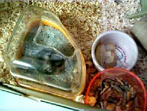 この三角形は仮設トイレ(のつもり)。実際には砂あび場になってます。 手前は小鳥用のエサ入れを利用。スッポリ入って食べます。 ショップで食べていた餌と同じものを中心に与えています。