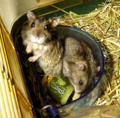 巣に戻ったリナ。子供を守る母の目をしてます。右は久しぶりのツーショットです。左がリナで、右がお父さんのピック。お乳をやってる間は水分が特に必要だということですので、生の野菜をよく与えています。その他、チーズ、クルミなどもちょっと多めに。