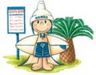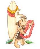 | サーフィンボーイはハワイに住む元気な男の子で、サーフィンを楽しんだり、フルーツをほおばったり浜辺で寝ころんだり、ウクレレを弾いて歌ったり・・・、最も得意なものはサーフィンで、カメハメハ大王の帽子をかぶってサーフボードを自由自在に乗りこなします。 |