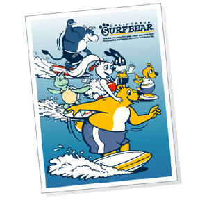 Surf Bearは、海が大好きな陽気な優しい熊。普段はライフガードの仕事をして生活していますが、オフのときはいつもサーフィンやウインドサーフィンなどのマリンスポーツを楽しんでいます。特にサーフィンの腕はなかなかのもので、いろんな大会に出場して優勝する事を夢見ているので、毎日頑張って練習をしています。