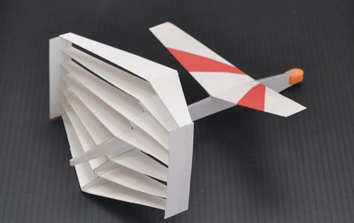 ダブルスラッシュ 複葉機競技規定をクリアしてできるだけ小さな主翼にしようとして開発したのがこの左右非対称機です。翼が上と下で左右にずれていて、前から見た姿はダブルスラッシュ(//)のようです。 全長197mm、全幅178mm、質量5.1g |