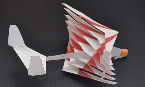 バイプレーンキメラ 本来デザイン競技用に開発した複葉無尾翼機ですが、こちらでも紹介します。 全長167mm、全幅173mm、質量8.5g |