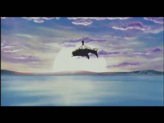 沈むパンドラを背後に進むヘリ