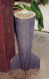 撮影地 : タ イ チェンセーン 撮影時期 : 1997年6月 他の所でも同じタイプを見かけた記憶がある。 写真ではよく分からないかも知れないが、これ実は古タイヤを利用した再生品のゴミ箱である。 うまく作ってあるなあ、と素直に感心しました。