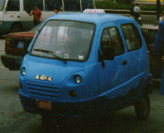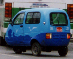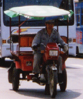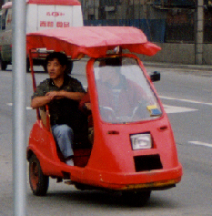 中国で走っているこれらの三輪車は、元は身体障害者用に作られたモノのようで、一番上の青いタイプの車には、後方にその旨が明記されていた。