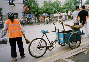 | 瀋陽で見かけた三輪車。 大連で見かけたのはリアカータイプだったが、 瀋陽のは、荷台が前側にあるタイプだった。 |