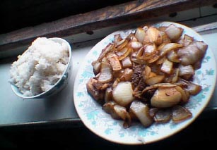 玉葱と牛肉の炒め物にご飯。 久々に中国の列車で食べた飯は美味かった(旅情付き でって事ですから。念の為^^)。ホントは、社内販売の弁 当を食べようと思っていたのだけど、なかなか来ないの で腹が減っている時に、食堂車のお姉さんが注文を取り に来て、寝台の所まで運んで来てくれるとの事だったの で頼んだ。 頼んだすぐ後に、弁当販売が来た。 弁当の方が儲けが少ないので、もしかしたら結託してい たのかも知れない。 ま、いいけど。
