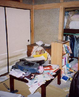 2001年3月24日 安芸灘沖地震後のぐいずの部屋の惨状 タンスからテレビ、ビデオデッキ、ラジカセなどか落ち、本棚からは本が飛び散り、かなりひどい状況となった。 この部屋の状況を一目見た母親の一言、 「普段とあまり変わらんがね。」 ・・・いや・・・そんな筈は・・・(汗)