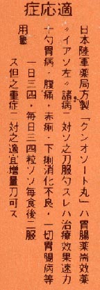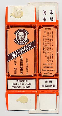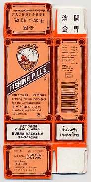 レトロチックな創業者の顔写真と言い、「日本陸軍薬局方製」で始まる日本語(一部意味不明)の説明書きの渋さと言い、和名が「クレオソート丸」で英名が「FISHING PILLS」という不可解さと言い、全く私好みです。