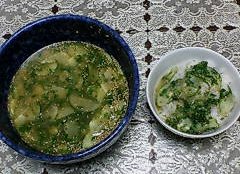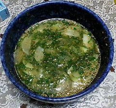 ![]() 冷汁本体 ![]() 冷汁と具ののったご飯・・・かな?? ![]() 汁までかかった完成品 これを混ぜて食べる なかなか美味そう♪ レシピ公開 普段お味噌汁作るように出汁を取ります 出汁が出来たら冷まします(ほんわり暖かくてもOK) 家で飲んでいるお味噌を冷ました出汁に入れ溶かします ↑出来れば赤味噌は止めて、合わせ味噌か白味噌がお勧め お味噌は普通より少し多めに入れる事 キュウリは1本の半分くらいを薄い輪切り 青シソは3枚くらいをみじん切りにしてお味噌汁に入れる 冷蔵庫に入れて冷やし、熱いご飯にかけて食べます 本来はすり鉢でお味噌もスリコギですりながら溶かします 地方によっては魚のすり身を入れたり 食べる前に氷いれたりしてます。 ウチはすりゴマ入れてるかな? |