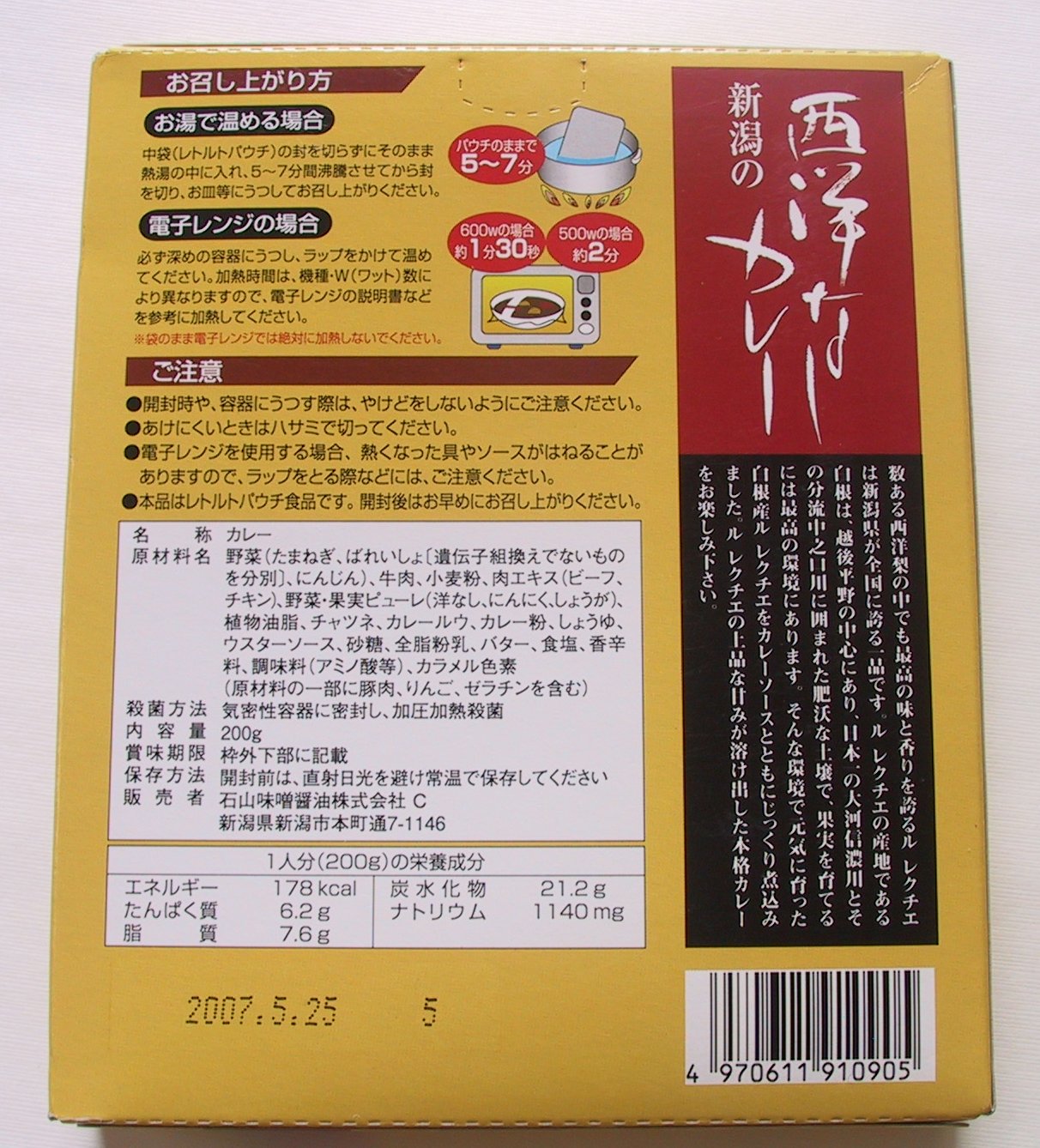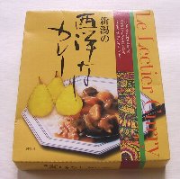 2005年9月23日(金) 松本城に一緒に行き その後 結婚された二人からお土産です 旦那が新潟出身って事で 一応 新潟産のカレーです まずは お土産ありがとうございました♪ しかぁ〜し 結構不安なカレーなんですけど・・・ 西洋なしカレー?? 聞いたことないぞ?? 西洋なしビールなら聞いた事があるけど カレーと西洋なし?? 合うのだろうか かなり不安の一品である(^^;;; でも 冷静に考えて りんご が 大丈夫なのだから 梨 だって問題ないでしょう(汗) まったく 変わったものを頂いてしまった・・・ きっと 昔の『イカチョコ(長野)』のお土産を 根に持っているのだろう・・・・( 笑っては 許してくれなかったらしい(ToT) 取り合えず解説を読む・・・・ なになに・・・ 数ある西洋梨の中でも最高の味と香りをもつ ル・レクチエとか書いてあります どうやら新潟で収穫されてる有名な梨らしい それを煮込んでカレーにしたのかぁ ふむふむ・・・ いきなり梨が見えるカレーではないらしい 一安心である(^O^) まぁ それならたいした被害はないだろう♪ って事で レトルトカレーなので 箱から出して コトコトと温めご飯に掛ける う〜ん どっから見ても普通のカレーです 恐る恐る 一口食べる・・・・・ ん・・・・・・ 二口・・・・・・・ ん?? 取りだてて変わった味はしない 三口・・・・・・・ うむ やっぱり普通のカレーです(笑) と言う事で ガツガツと食べる♪ う〜ん こらぁ 普通に食べれますし 辛味も少なく 美味しい♪ 結構 私向きかも(爆) いやぁ〜 最初は びびってましたが なんて事はない 美味しいカレーでした 残念でしたね りかまま さん(笑) 次帰ったら 自分たちで食べてみてください マジに 美味しいですよぉ〜 P.S 何度も言うようですが 辛いのは駄目ですよ〜 私は 苦手なので カレーなら 中辛程度で抑えてくださいね |