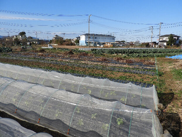 畑の一部です。左は、手前からソラマメ、タマネギ、イチゴ、ニンニクで、遠くにブロッコリーです。右は、手前からコカブ、ソラマメ、ホウレンソウです。