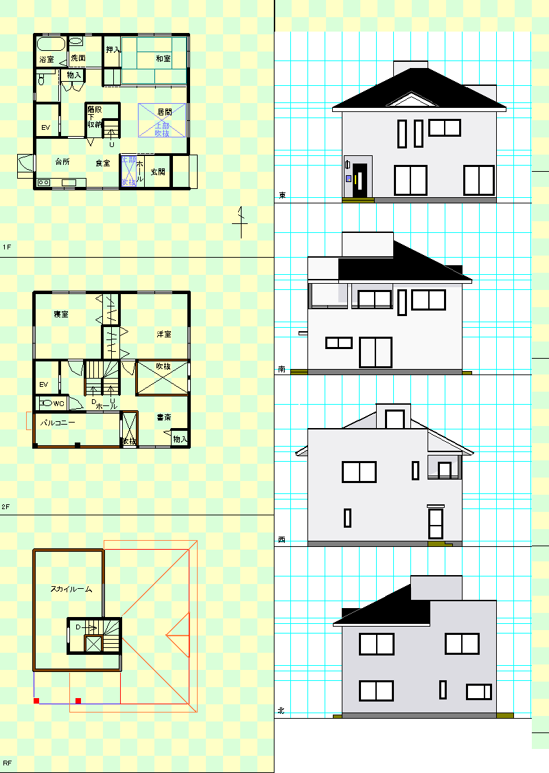 今までのものは1階のリビングと和室を採光のために南面にしようとしてたのを、この2つを道路側の東面に向けて午前中の日差しを優先し、ダイニングキッチンを南向きにしてみました。