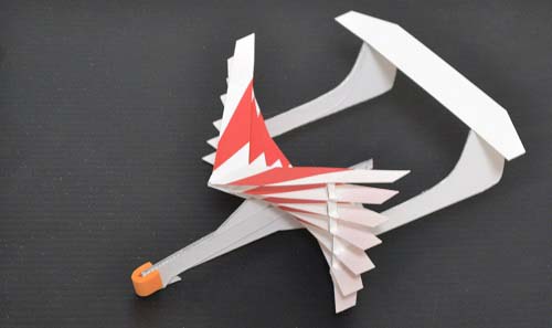 ペガサス2025 オール紙製カタパルト4葉垂直上昇機です。北斗2025と基本設計思想は同じで、その弟分です。 全長220mm、全幅166mm、全高約65mm、質量12.2g |