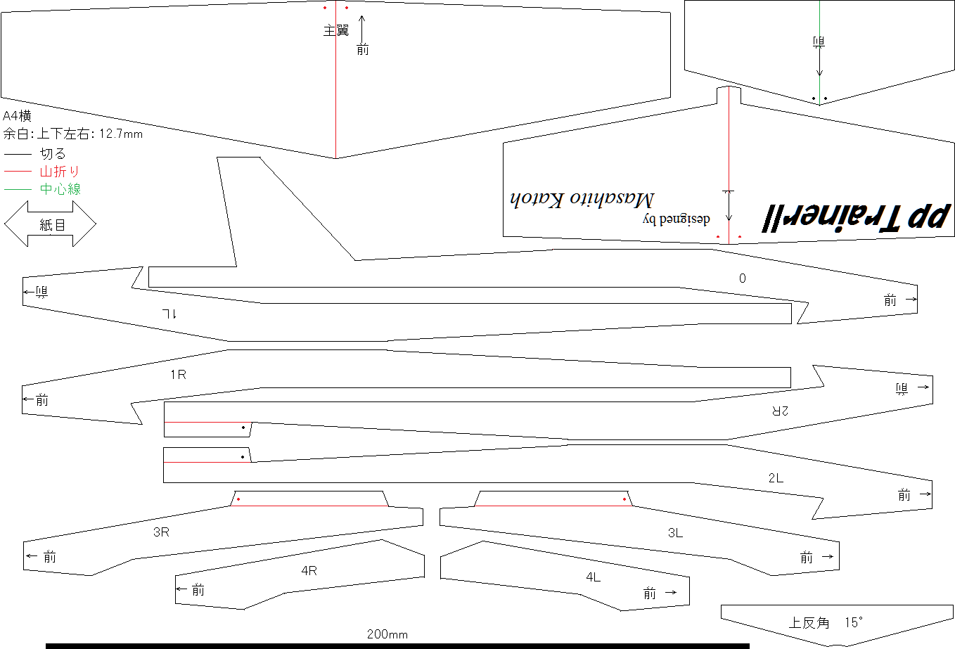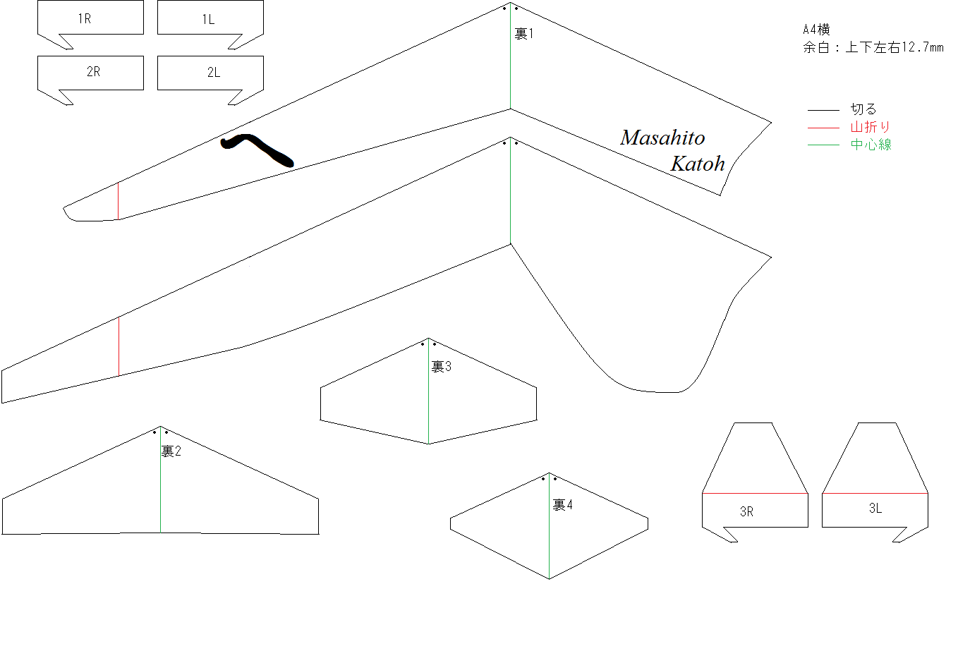 | こちらは、私のオリジナル紙飛行機の図面ダウンロードです。個人で楽しむ分にはご自由にお使いください。今後の参考までに掲示板に何をダウンロードしたかを残していただけると助かります。(たぶんないとは思いますが)商用利用される場合は事前にご連絡ください。連絡先は総合目次にあります。 ダウンロードした図面は、特記が無い限りMS-paintの印刷のページ設定をA4横置き上下左右余白12.7mmとして印刷してください。余白に特記があるものはそれに合わせてください。「名刺」の表記のあるものは名刺サイズ(91mm×55mm)の用紙に余白なしで印刷ください。 |