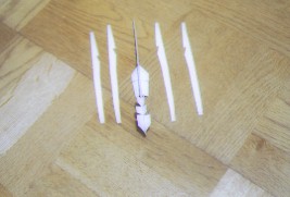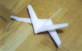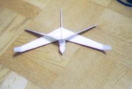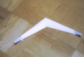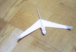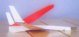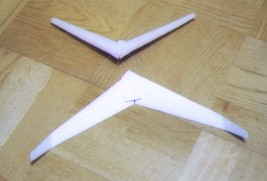 ![]() 主翼心に結合部材を張る。このとき主翼の中心部での曲げ具合(上反角)をアングルゲージで正確に合わせる。 ![]() 下主翼(後退翼)両端の折り曲げて垂直尾翼にした部分の根本に補強材を張る。 ![]() 胴体頭部の補強兼おもりを張り付ける。 ![]() 下主翼(後退翼)を胴に張り付ける。 ![]() 上主翼(前進翼)を胴体に張り付ける。 ![]() 組立終了 ![]() 塗装後、頭に安全プロテクタゴムスポンジを取り付けて、重心位置を確認する。重心位置は下主翼取り付け位置後端から前3mm。重心調整のために、先端を数mm切断してもよい。下主翼は先端をいくらか、後ろを上にねじっておく。この部分がエレボンになる。 |