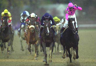 | 20世紀最期のクラシックはその名にふさわしい素晴らしい顔合わせとなりました。 ケンタッキーダービーを1番人気で優勝し、4歳ナンバーワンと言われたきたフサイチペガサス(Fusaichi Pegasus)、 昨年のベルモントSを勝ち、古馬ナンバーワンのレモンドロップキッド(Lemon Drop Kid)。 昨年の同レース優勝馬のキャットシーフ(Cat Thief)、そして、若きアイアンホースのジャイアンツコーズウェイ(Giants Causeway)。 しかし、優勝したのは新星のティズナウ(Tiznow)であった。 レースはいわゆる前残り、前半のスローペースがひびいたため、後続馬にはノーチャンスとなった。 彼は、直線でのジャイアンツコーズウェイとの息が詰まるような叩き合いを制して優勝! フサイチペガサスはミスタープロスペクター産駒らしいムラのあるレース振りで6着に惨敗した。 終わってみれば、上位4着までを4歳馬が独占し、今年の4歳馬のレベルの高さを証明したことになったようだ。 ティズナウは体調が弱かったために3歳時には出走せず、4歳の4月にデビュー。しかし、初勝利は3戦目の5月31日であった。 その頃、フサイチペガサスはケンタッキーダービー制し、4歳ナンバーワンに君臨していた。 一方、ティズナウの素質はそこから開花!初勝利の後、いきなり重賞に挑戦しG3アファームドHに優勝。 続く、G1スワップスS、G1パシフィッククラシックでは2着であったが、G1スーパーダービーをトラックレコードで圧勝。 陣営は当初、新設のJCダートへの出走を目標としていたが、体調が良いこと、今なら好勝負できることを考慮し、追加登録料を払ってのクラシック出走となった。 尚、ティズナウの全弟のバドロワイヤルは昨年のBCクラシック2着馬である。 ティズナウは来年も現役を続行、ドゥバイWCに参戦する予定らしい。 また、年度代表馬の座はフサイチペガサスからティズナウに移りそうな気配。 だ〜〜から、フサイチじゃ勝てない!って言ったでしょ!(笑) |