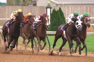 | 2000年BCの初戦であるディスタフ。 BCスプリントと並んで、本年最も固いと言われたこのレース・・・。 1番人気はリボレッタ(Riboletta)。 天才少女フランダースの娘サーフサイド(Surfside)、愛1000ギニーなど欧州春のマイル女王クリンプリン(Crimplene) ディフェンディング・クイーンのビューティフルプレジャー(Beautiful Pleasure)などが出走! 史上2番目という大観衆の中、波乱の予感・・・。 スタートで飛び出したサーフサイド。リボレッタは出遅れて8番目。 ビューティフルプレジャーも7番目。クリンプリンは中段。人気薄のスペイン(Spain)が好スタート! レース序盤、出遅れたビューティフルプレジャーが上がっていき、サーフサイドに並ぶ勢い。 その直後にスペイン。リボレッタはどうしたのか!? レース中盤、サーフサイドの走りは衰えない。サーフサイド、ビューティフルプレジャー、スペインの三つ巴。 しかし、ビューティフルプレジャーは4角でバテた。 直線で先頭に出たスペインがサーフサイドと叩き合って、完勝! リボレッタは直線入り口で既にレースを辞め気味。全く良いところ無し。 ブービー人気が勝って、配当は大荒れであった。 D.ルーカス師の管理馬の1,2フィニッシュ!! |