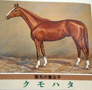 | クモハタは、四白流星、明るい栗毛の馬だった。この”靴下をはいた”貴公子はとても神経質で、飼い葉桶の中にネズミの糞が1粒でも混じっていれば飼い葉を口にしなかった。 調教師は困って、桶の上に濡れ手ぬぐいをかけてネズミを防いだということだ。 また、クモハタは蹄叉腐爛(てんさふらん)・・・蹄の病気・・・という持病があり、ダービー前は、鼻から豆乳を注入したり、局部注射をしてダービーに臨んだ。 そして、勝った! |