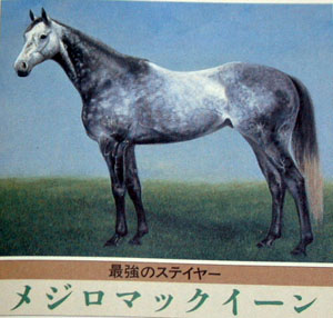 | 史上初の天皇賞父仔三代制覇。昭和45年秋のメジロアサマ、昭和57年秋のメジロティターンに続き、平成3年春に、その偉業を達成したメジロマックイーンには、壮大な血脈のドラマがあった。 極端に受精率が悪いメジロアサマから、数少ない産駒の1頭であるメジロティターンの仔として誕生した彼は、 故北野豊吉氏の努力と執念が実を結んだものだった。翌年トウカイテイオーとの対決で注目を浴びた同レースで2年連続優勝。その後種子骨骨折という競走馬生命の最大の危機を克服し、3連覇を目指した春の盾で2着に敗れたものの、宝塚記念では快勝した。菊花賞優勝を含め、彼には一流のステイヤーという評価が目立つが、中距離でも引けを取るものではなかった。 そして、父仔四代制覇という種牡馬としての夢を託され、世界初の10億円ホースは新たな挑戦を始めた。 |