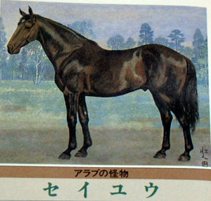 | 「外からラプソデーあたりも突っ込んでくる。しかし、内のセイユウが残った・・・・」 昭和32年のセントライト記念である。サラブレッド相手に3つの重賞を制したセイユウだが、このような例は中央競馬では最初で最後であった。49戦26勝(うちサラ戦24戦5勝)の競走成績にもまして圧巻なのが種牡馬としての実績。昭和41年には何と238回の種付け回数を記録するなど、その種牡馬としての能力を誇示し続けた。そんな彼を”アラブの怪物”と人は言う。 |