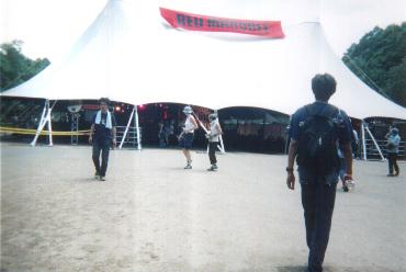 10時。テントを出発。が、入場ゲートから連なる人の列。列。列。しかも並んでる途中から雨。ハイネケンがビニールの合羽を配っていた。結局入るのに1時間もかかってしまった。おかげで朝一発目のスマッシュ社長=日高大将の挨拶も、フィッシュボーンのスタートも見れず。がっくし。