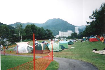 早朝5時すぎ、苗場スキー場着。休む間もなくキャンプサイトに行きテント設営。比較的苦労せずにテント設置完了したのが6時ごろだった。そこから仮眠する。だがテントの中は暑く、寝れやしない。9時を過ぎたぐらいからサウンド・チェックの音が流れてくる。ここでわかったのがテントを設営した位置。我々がキャンプサイトに到着した時にかなりの数のテントが設営されていた。俺が考えたのは入り口から遠くても、平坦で、通路に近く、セキュリティーのテントからも近く、さらに廻りに特徴のある場所であったのだが、なんと隣の川を挟んだ向こうはは朝5時まで開かれるダンス・テント=レッド・マーキーだった。こりゃ低音で夜は寝れないかなと思ったが、耳栓持ってきたから大丈夫だろうということで、そのままにする。